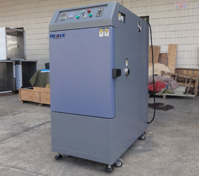 耐黃變試驗機作用為仿真陽光的紫外線輻射及熱度, 試樣于機臺內經紫外線照射與溫度作用, 經過一段時間后,觀察試樣耐黃變的程度(一般認為70℃時材料在箱體內試驗3小時相當于自然環境中2個月黃變效果)可用染污灰色標作參考, 判定其黃變的等級.產品在使用過程中受陽光輻射或運輸過程中,貨柜環境之影響所發生顏色之改變造成產品的所瑕疵.使用300W之UV燈泡,使實驗能夠在較短時間完成,可作為基本的耐黃變試驗,亦可當老化試驗機及烘箱使用, 呈現一機多用途的功能.
